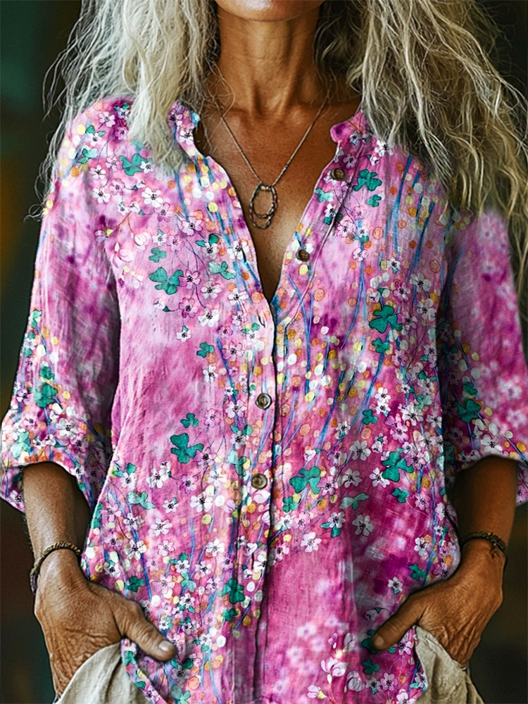 Women's Floral Pattern Art Print Casual Cotton Linen Shirt