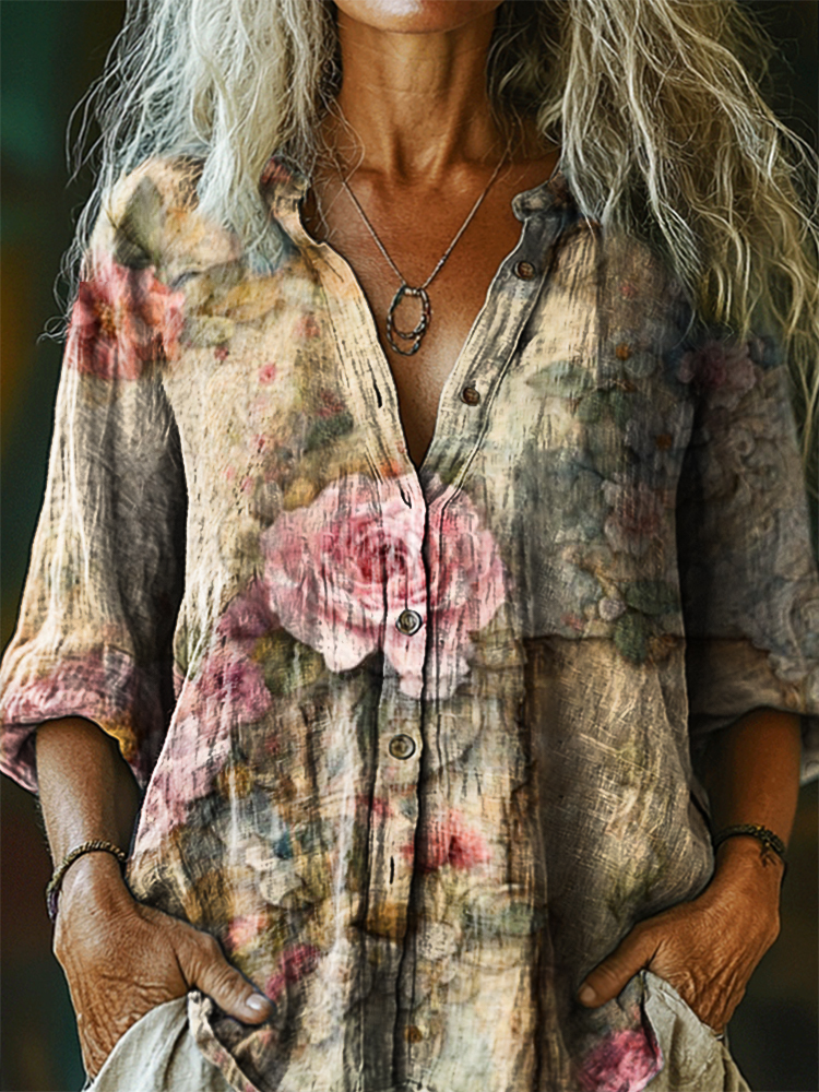 Women's Retro Floral Art Print Casual Cotton Linen Shirt