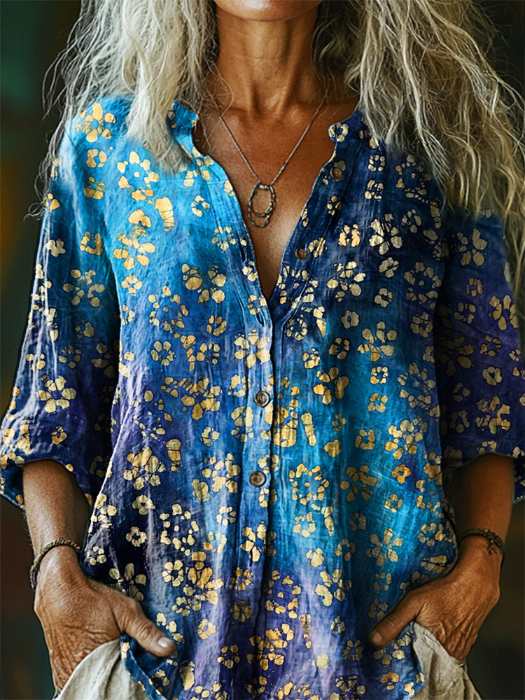 Women's Retro Floral Art Print Casual Cotton Linen Shirt