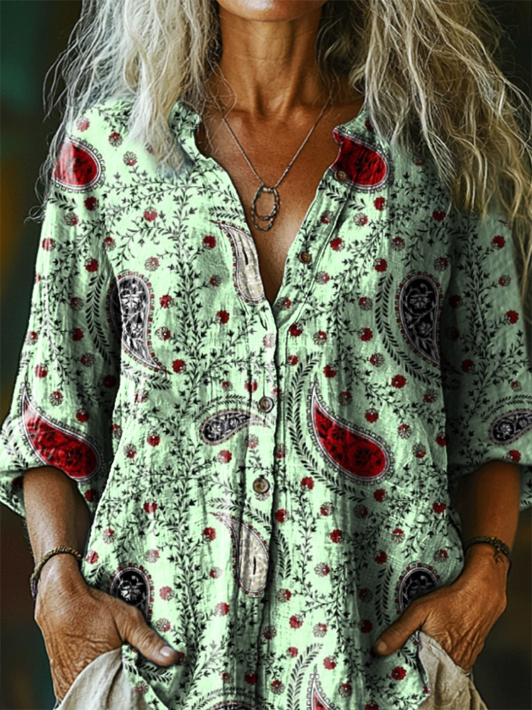 Women's Retro Paisley Floral Art Print Casual Cotton Linen Shirt