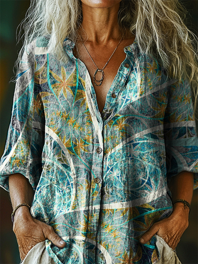 Women's Vintage Bohemian Floral Art Print Casual Cotton Linen Shirt