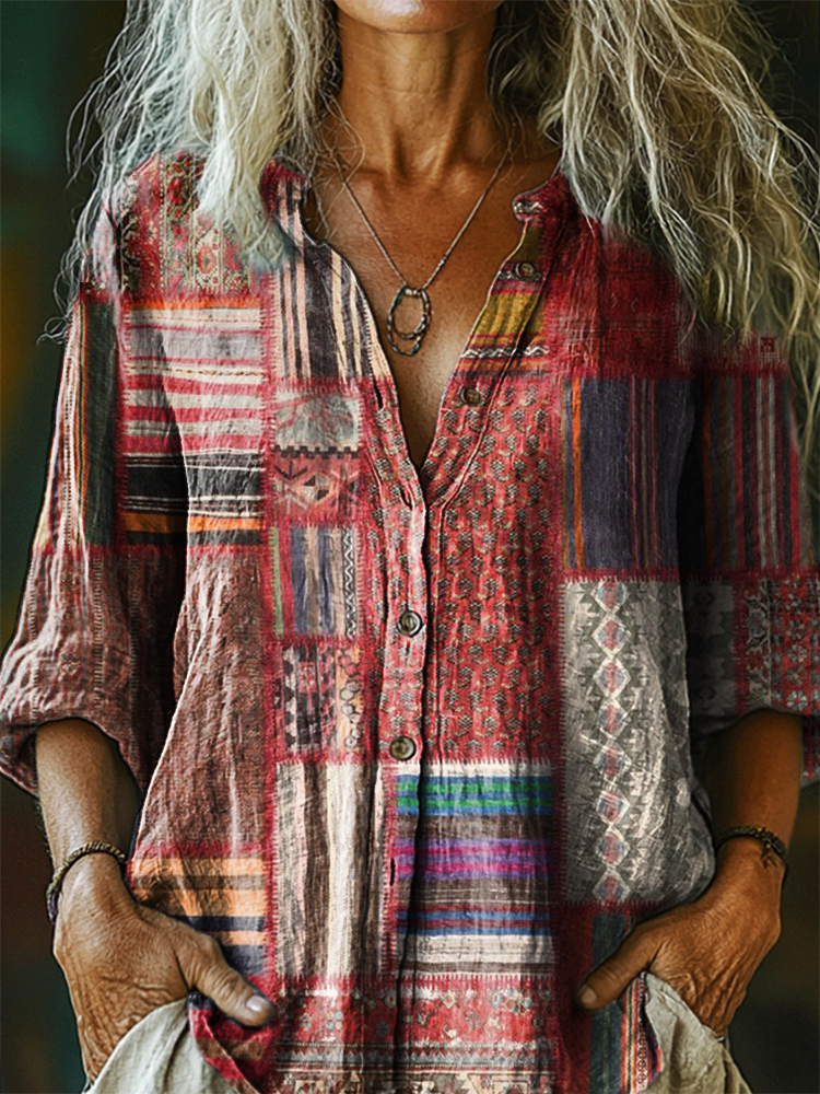 Women's Vintage Ethnic Floral Art Print Casual Cotton Linen Shirt