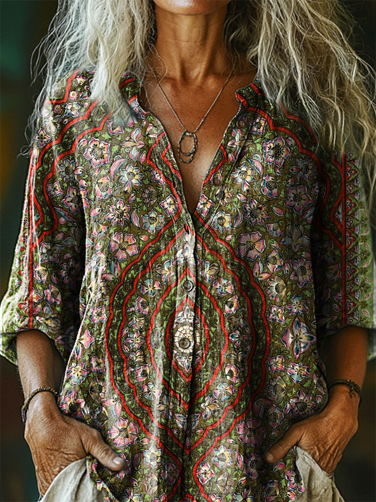 Women's Vintage Ethnic Floral Art Print Casual Cotton Linen Shirt