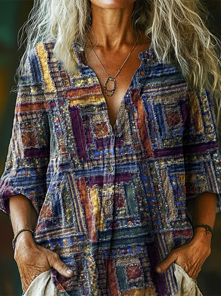 Women's Vintage Ethnic Patchwork Art Print Casual Cotton Linen Shirt