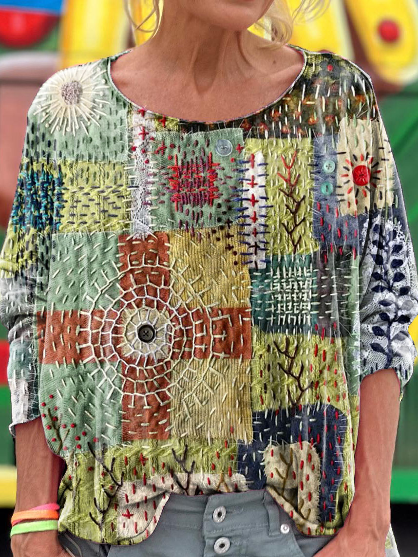 Women's Vintage Ethnic Patchwork Art Print Casual Long Sleeve Top