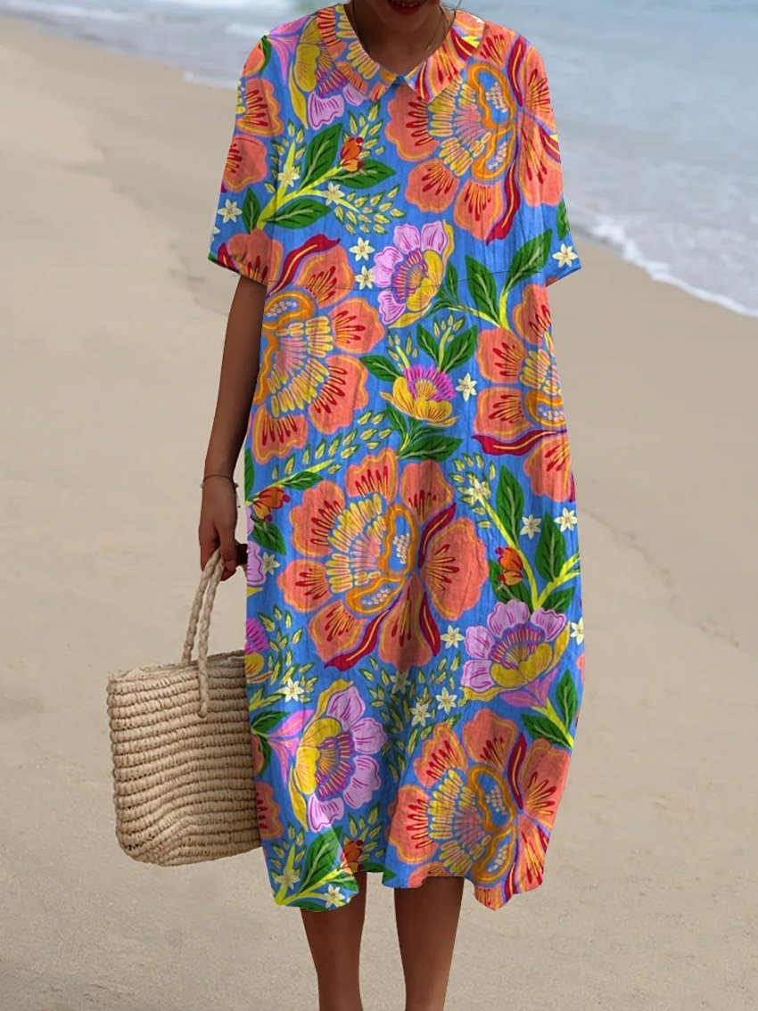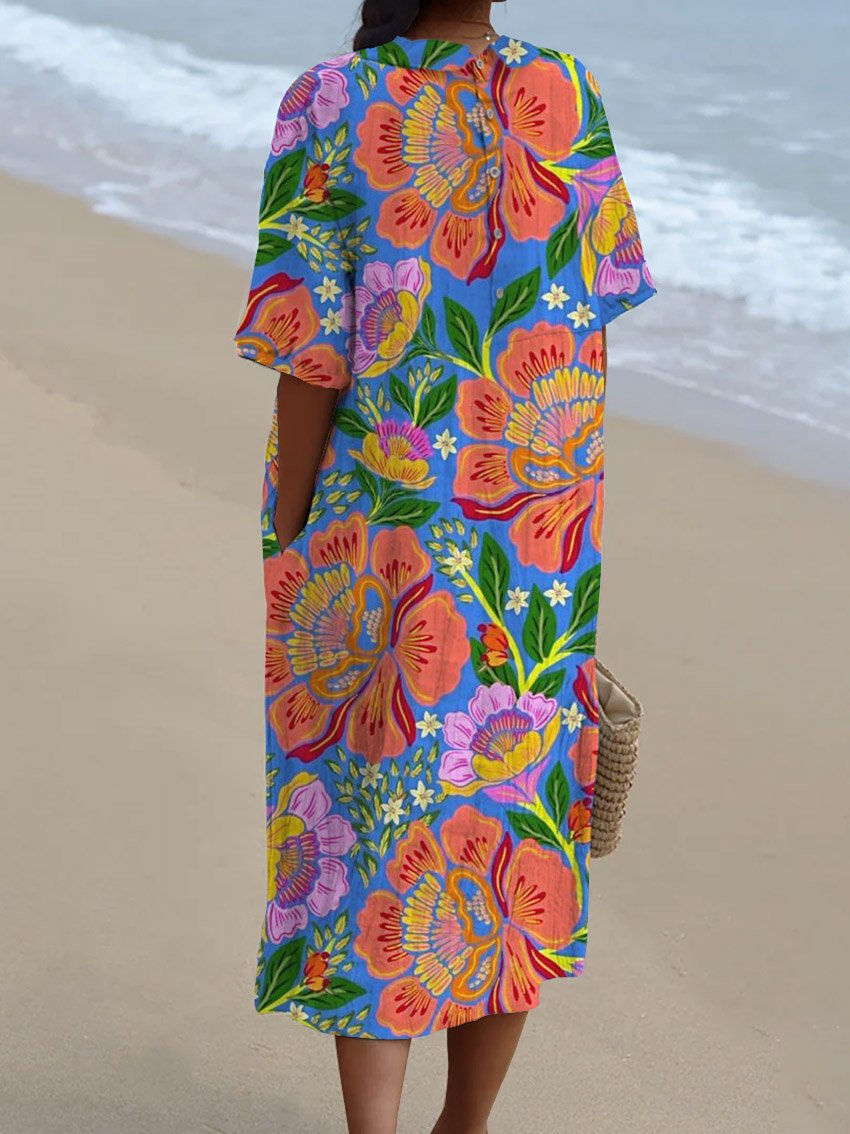 Women's Vintage Floral Art Print Pocket Linen Dress(Convertible Dress With Front And Back Option)