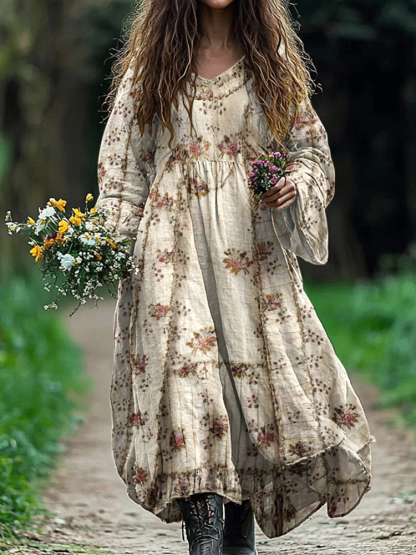 Women's Vintage Floral Print Linen Blend Midi Dress