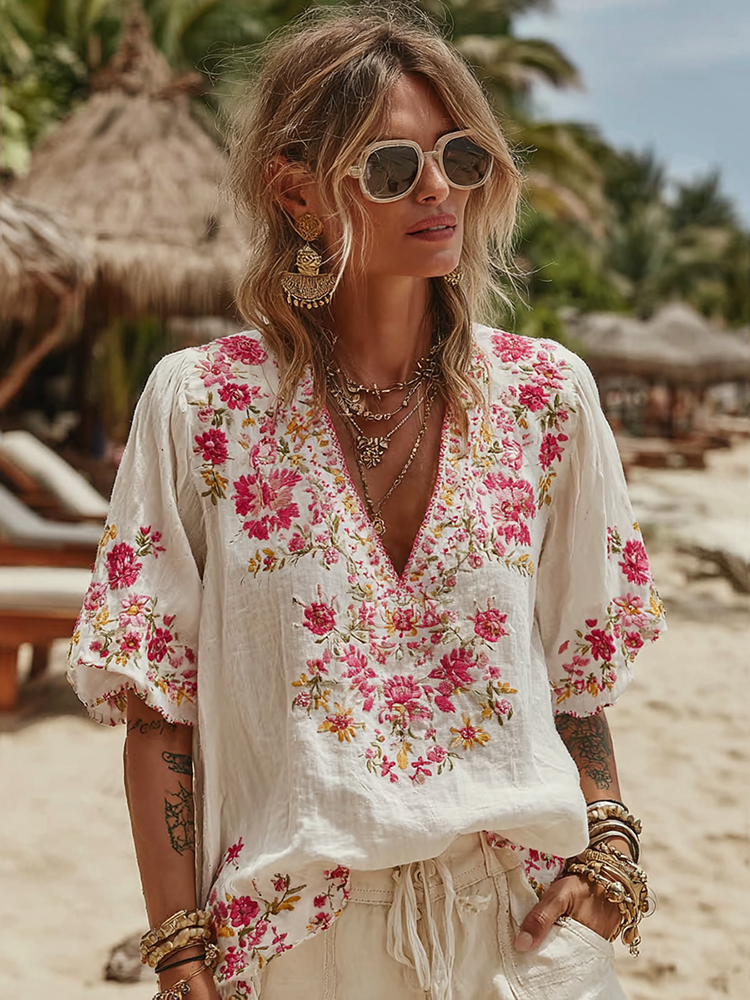 Women's Vintage Rose Floral Art Linen Comfy Shirt