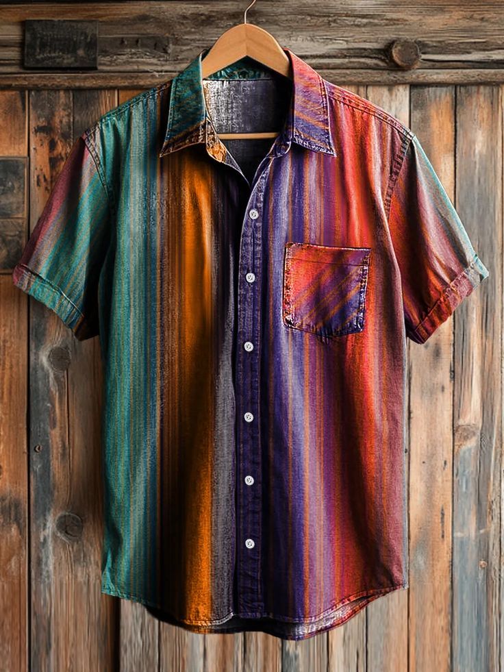 Men's Retro Gradient Stripe Art Print Lapel Short Sleeve Pocket Shirt
