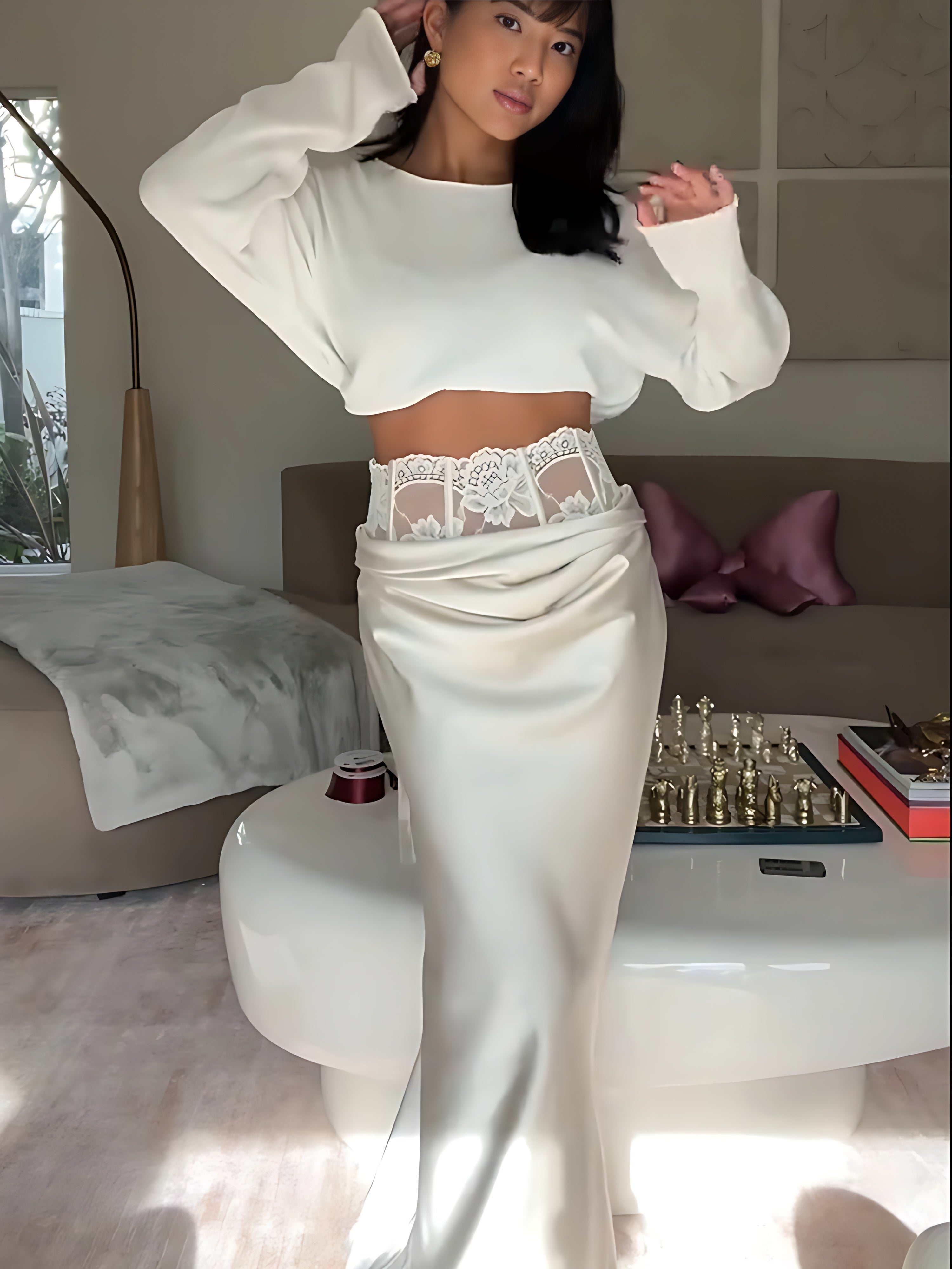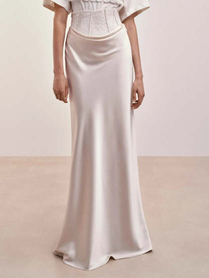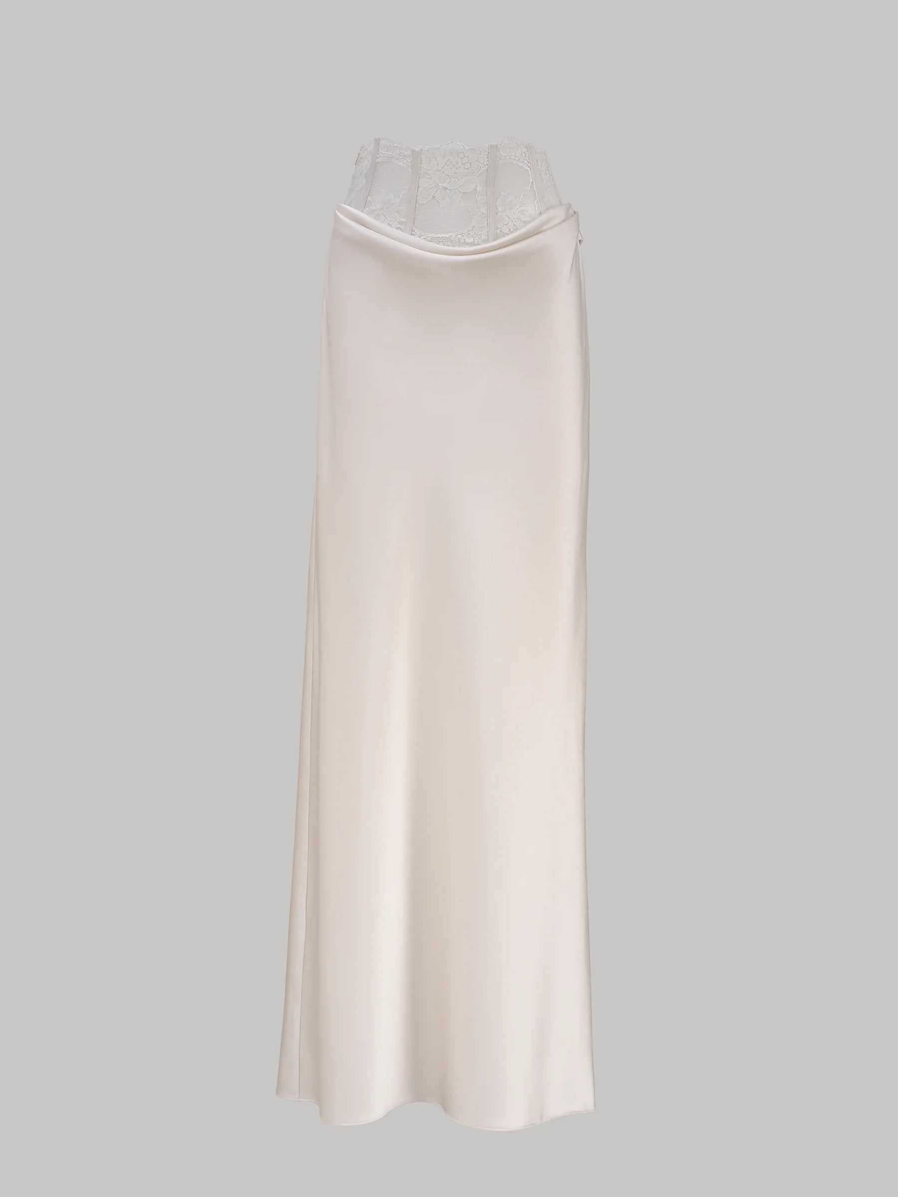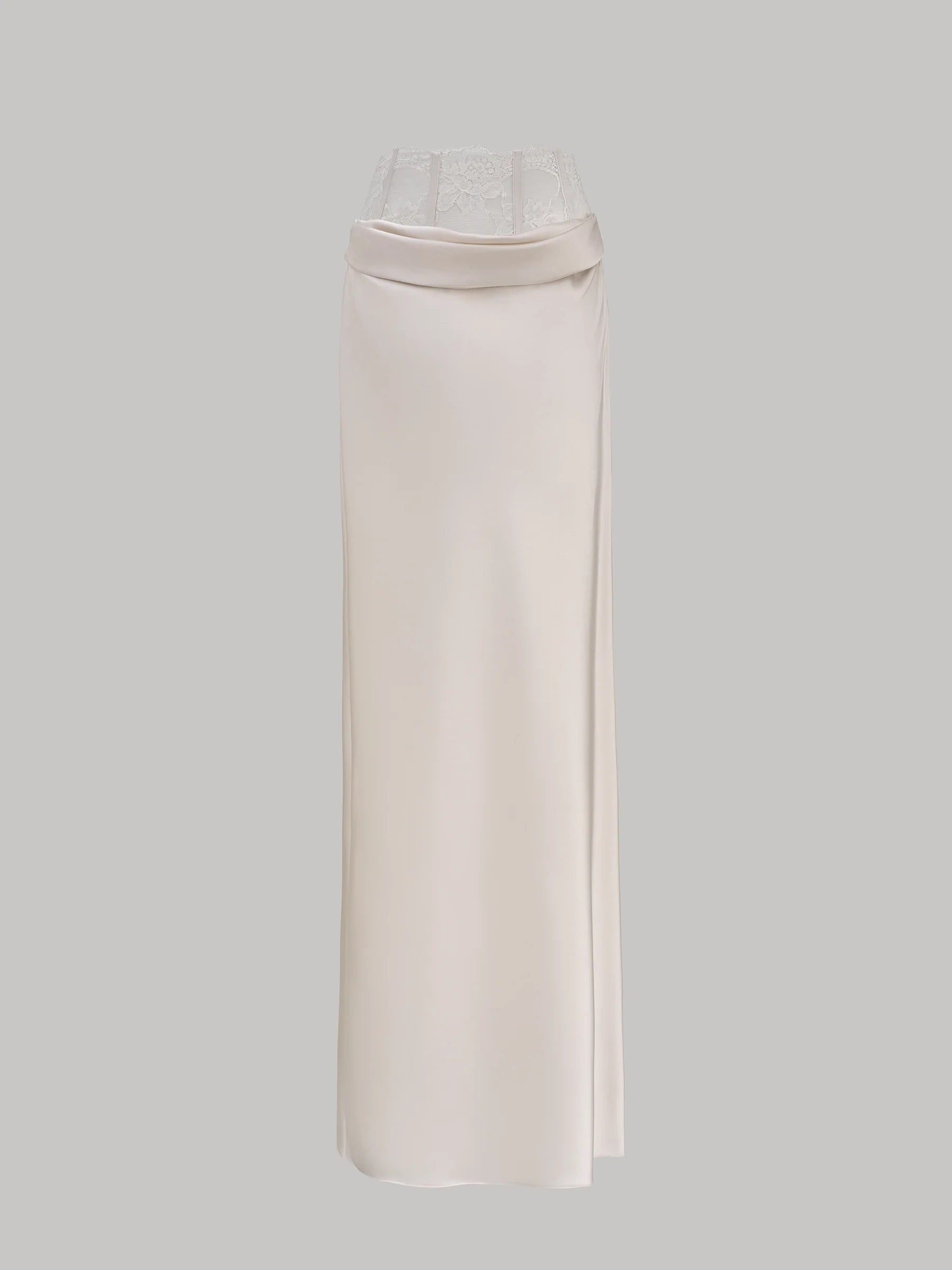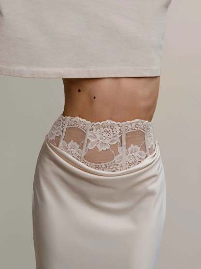 The lace waistband draws inspiration from the delicate lines of lingerie, evoking a subtle sense of exposure and modesty. The cascading drape mirrors the fluid elegance of fabric in motion, creating a silhouette that is effortless. Crafted with intention, the design disrupts conventional notions of intimacy by bringing these hidden details to the forefront.