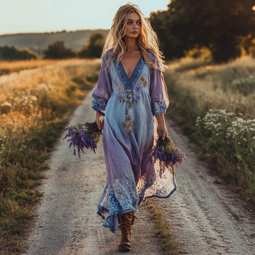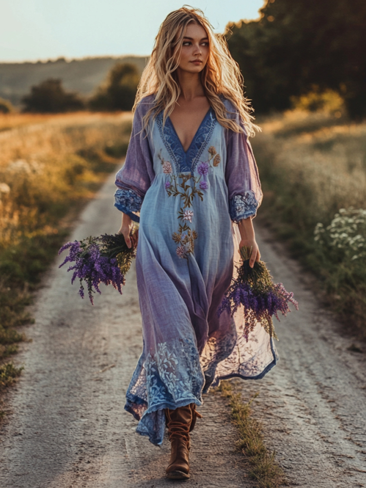 Spring Girl Green Pastoral Style Retro Floral Embroidery Pattern Art Linen V-neck Maxi Dress