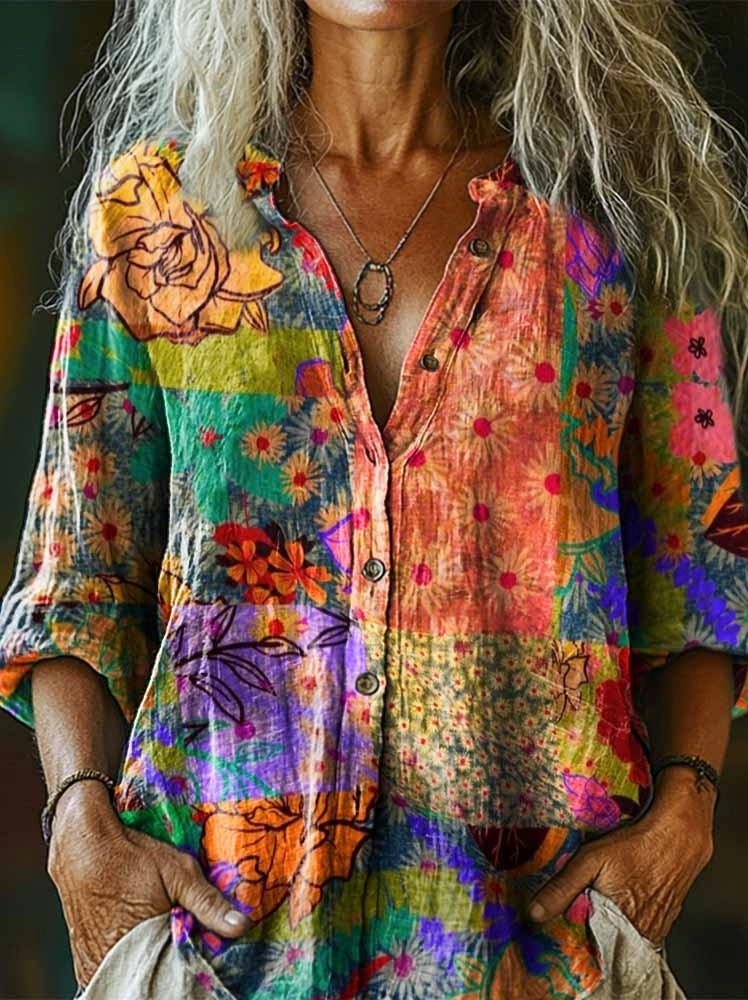 Women's Boho Floral Collage Art Pattern Print Casual Cotton Linen Shirt