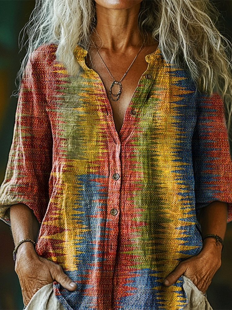 Women's Vintage Ethnic Contrast Art Print Comfortable Long Sleeve Cotton Shirt