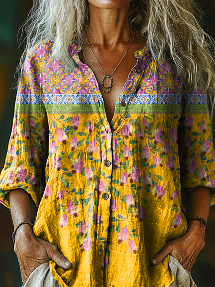 Women's Vintage Ethnic Floral Art Print Casual Cotton Linen Shirt