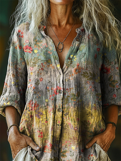 Women's Vintage Floral Art Print Casual Cotton Linen Shirt