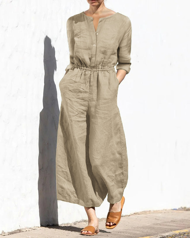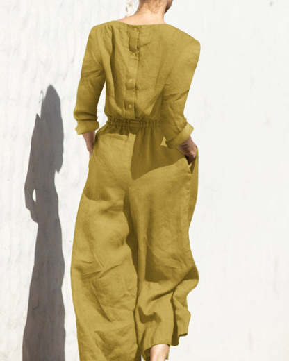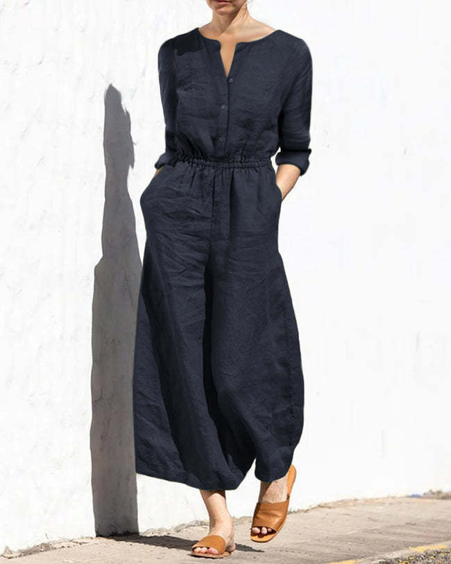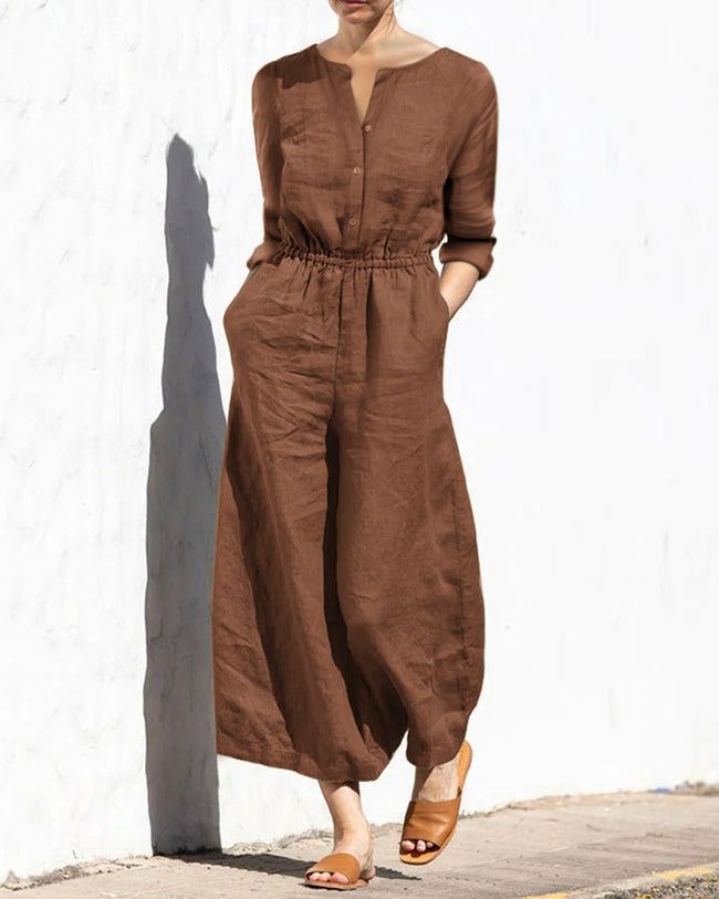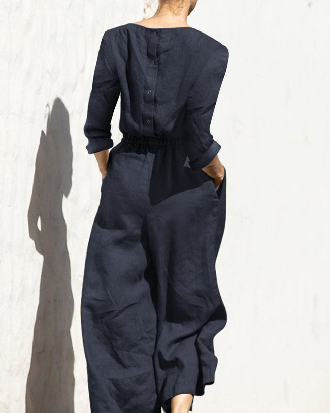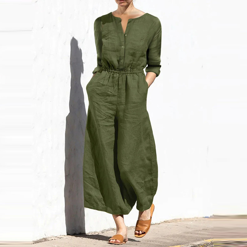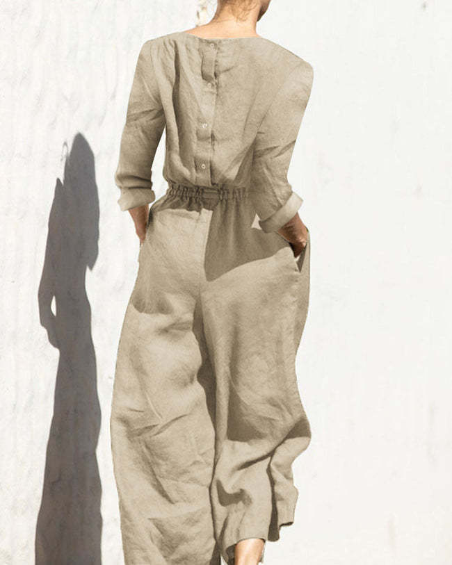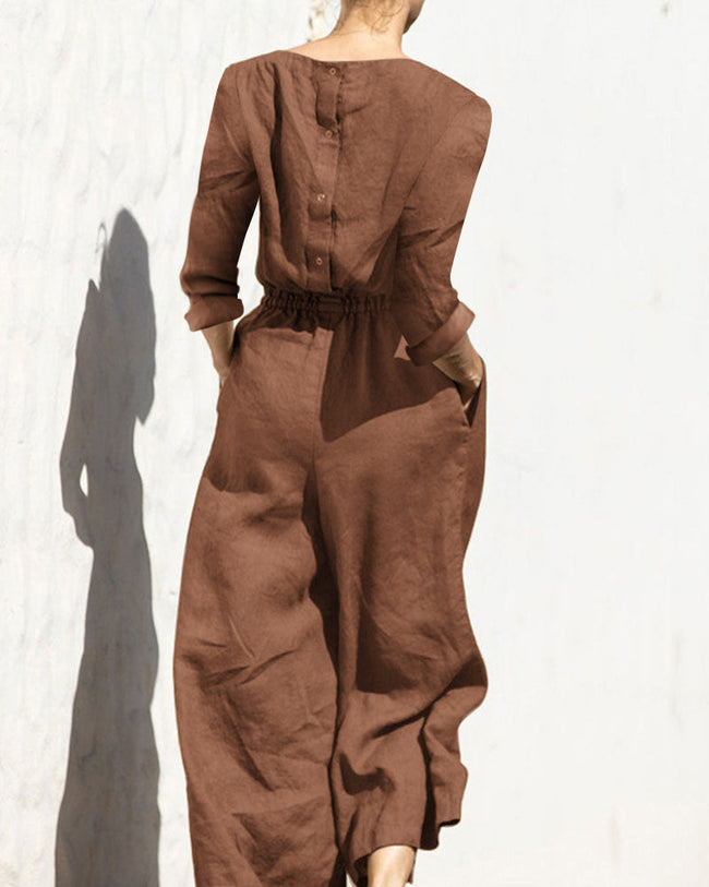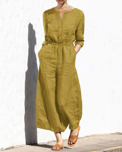 Casual Loose Solid Color V-neck Linen Long-sleeved Jumpsuit