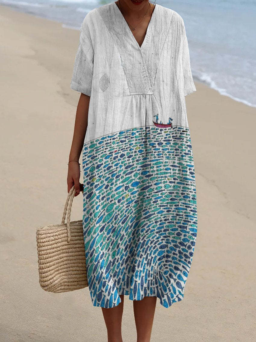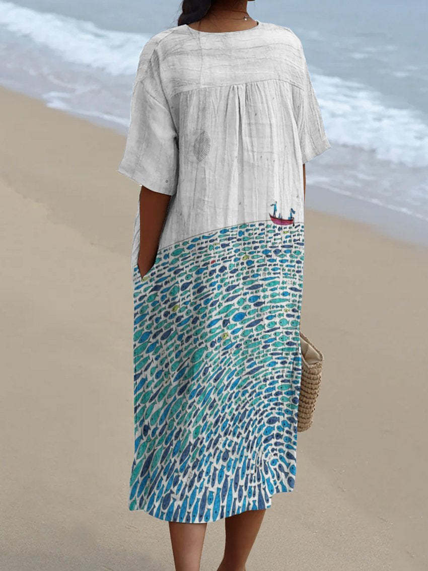 Ocean Full of Fish and Boats Decorative Pattern Flowy Dress