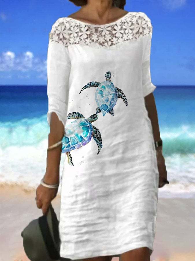 Women'S Beach Turtle Print Lace Cotton Dress