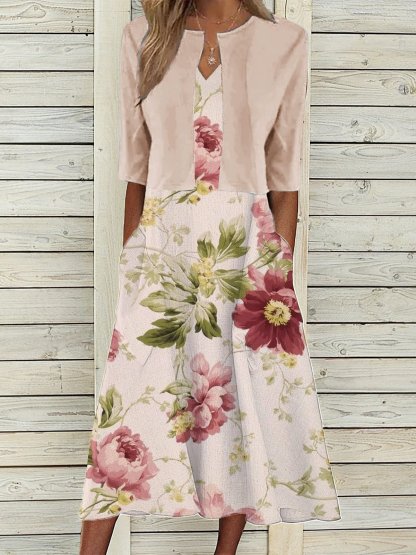 Women's Casual Printed Tank Top Dress With Mid-Sleeve Cardigan Two-Piece Set