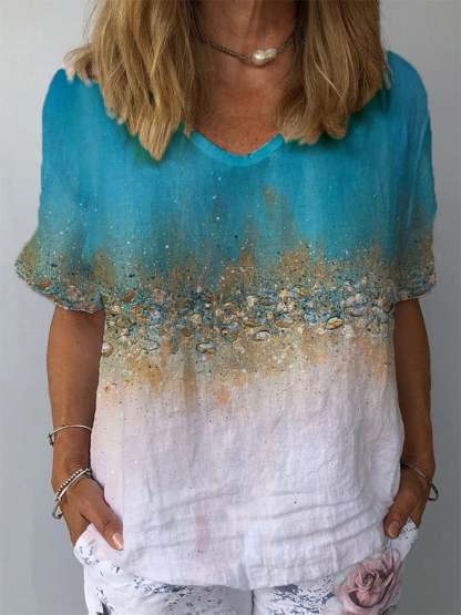 Women's Cotton Linen Seaside Print Casual Loose Top