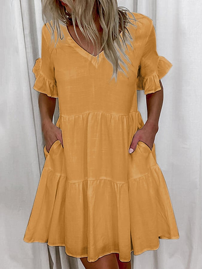 Women's Cotton Linen V-neck Solid Color Pocket Dress
