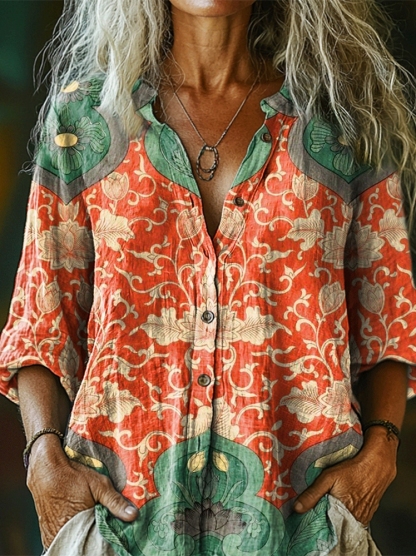 Women's Ethnic Floral Art Print Linen And Cotton V-neck Casual Shirt