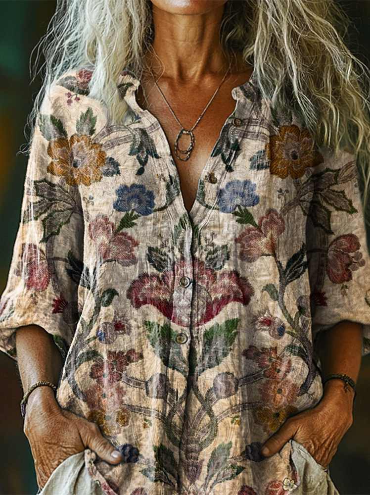Women's Ethnic Floral Patterns Print Linen Cotton V-neck Casual Shirt