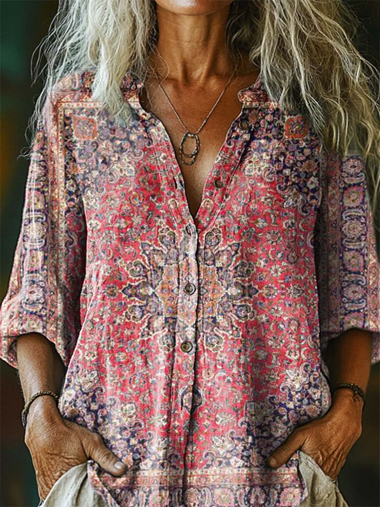 Women's Ethnic Pattern Art Print Linen Cotton V-Neck Casual Shirt