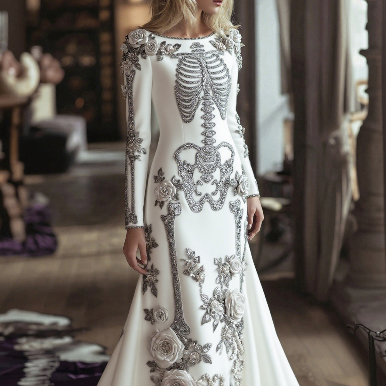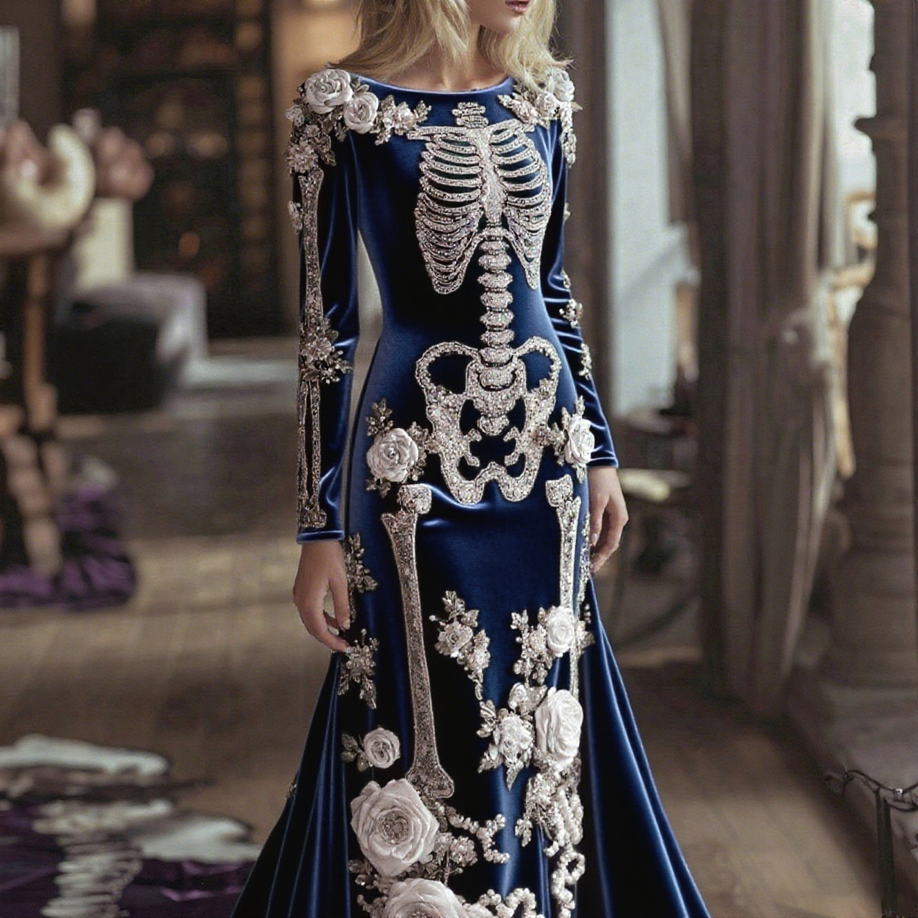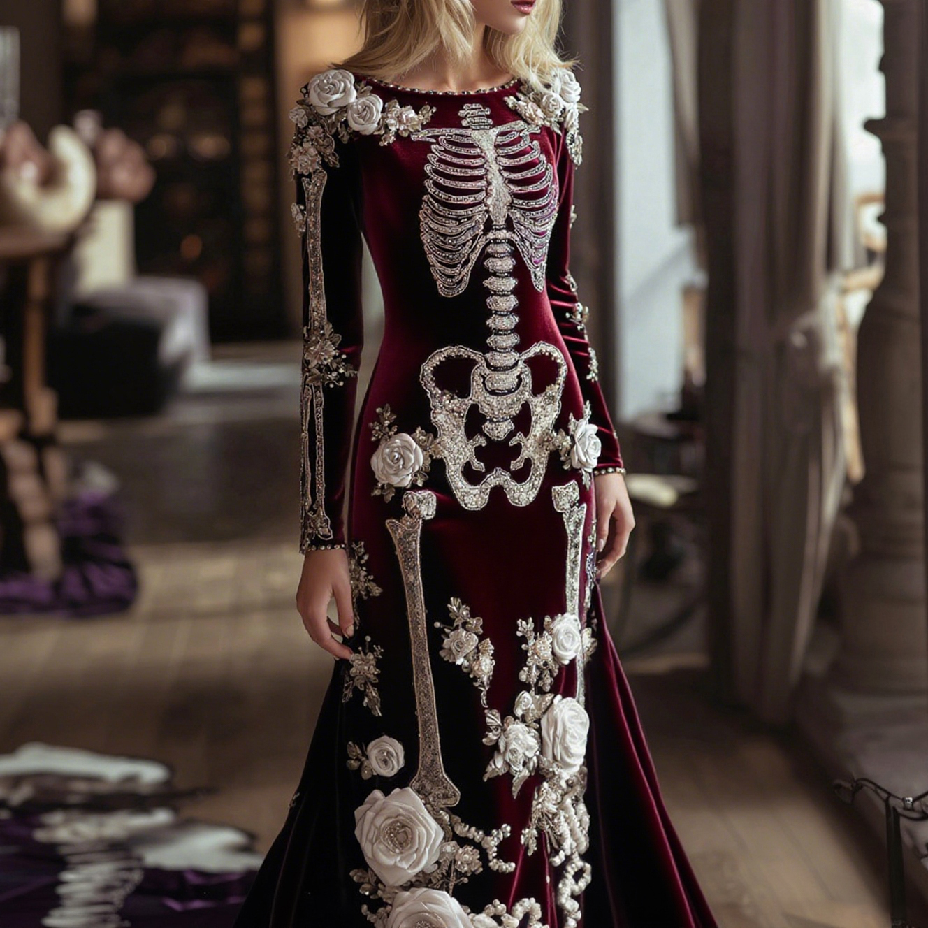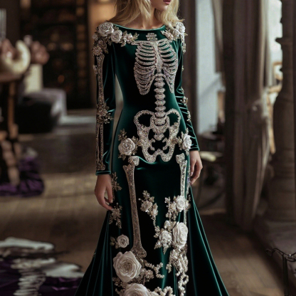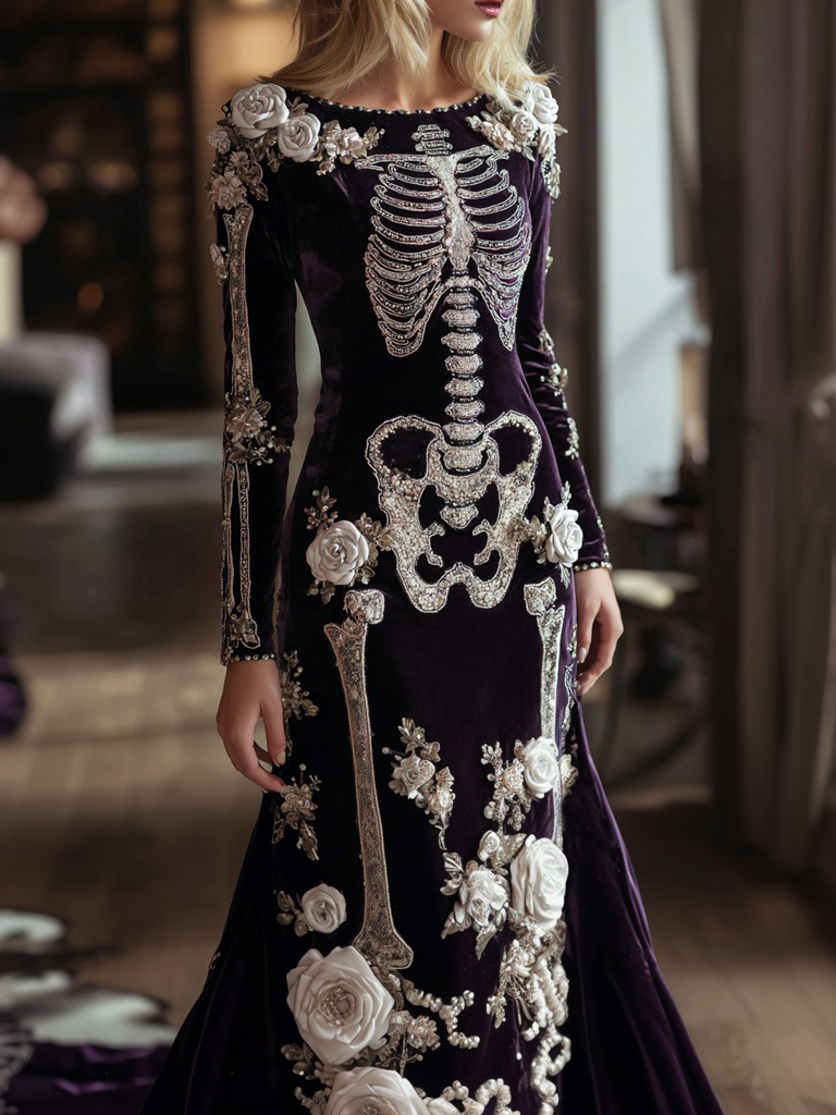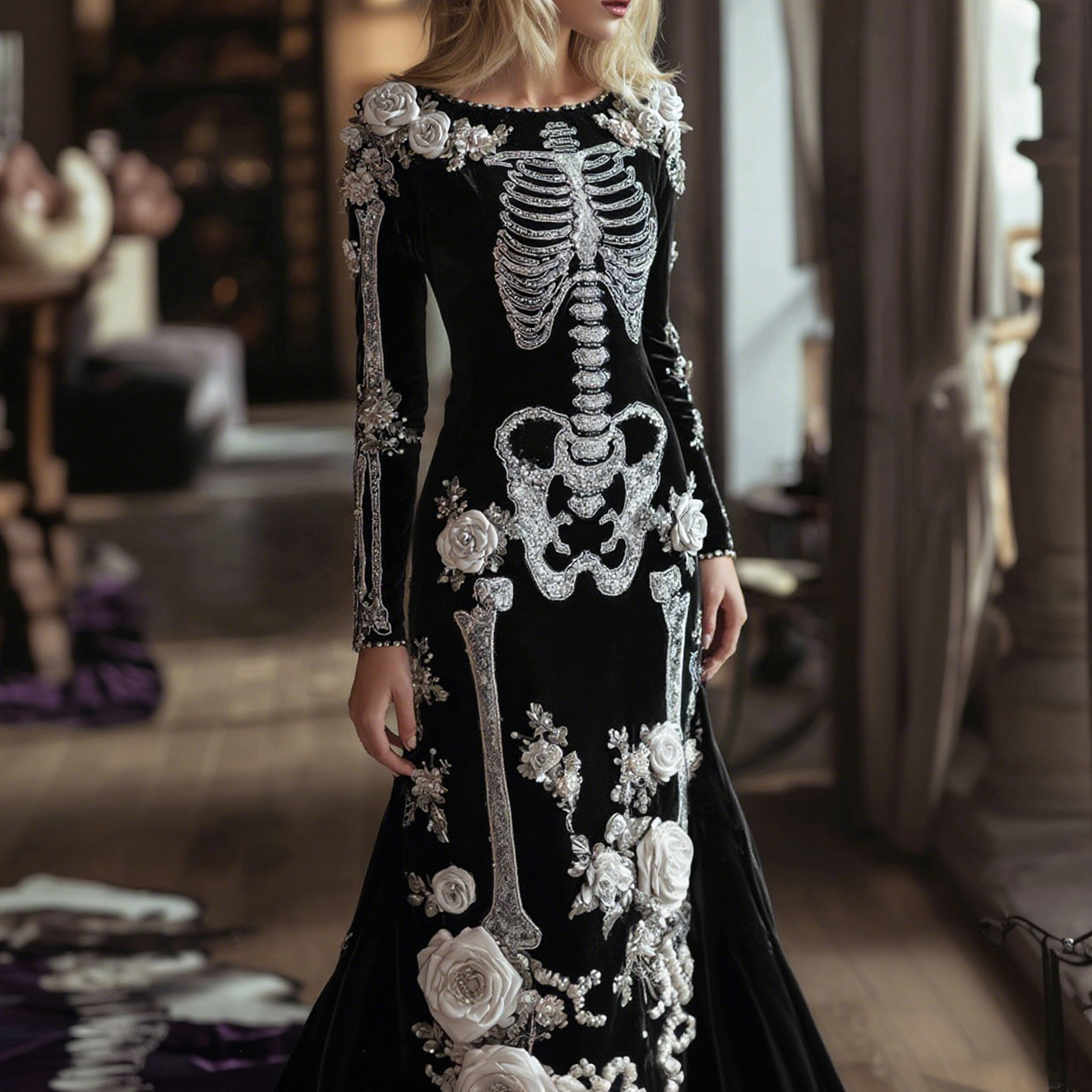 Women's Halloween Dark Gothic Rose Skeleton Velvet Round Neck Maxi Dress