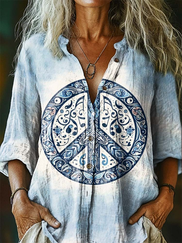 Women's Hippy Pattern Art Print Linen Cotton V-Neck Casual Shirt