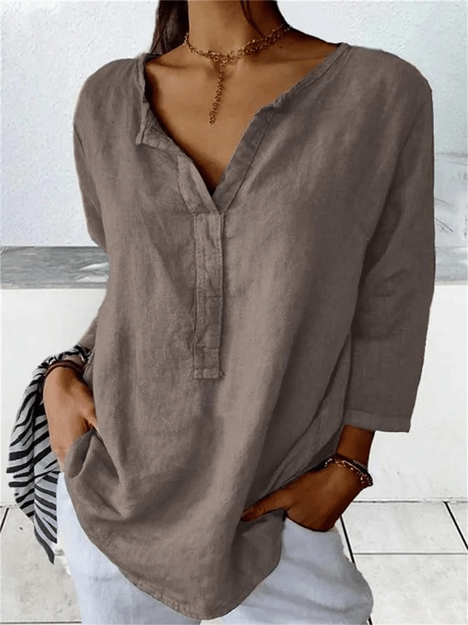 Women's Loose Solid Color V-Neck Cotton And Linen Shirt