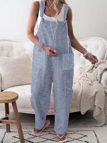 Women's Retro Striped Design Casual Pocket Jumpsuit