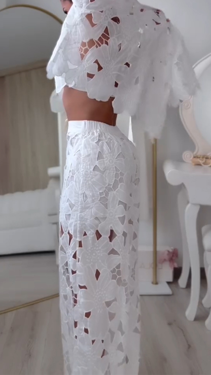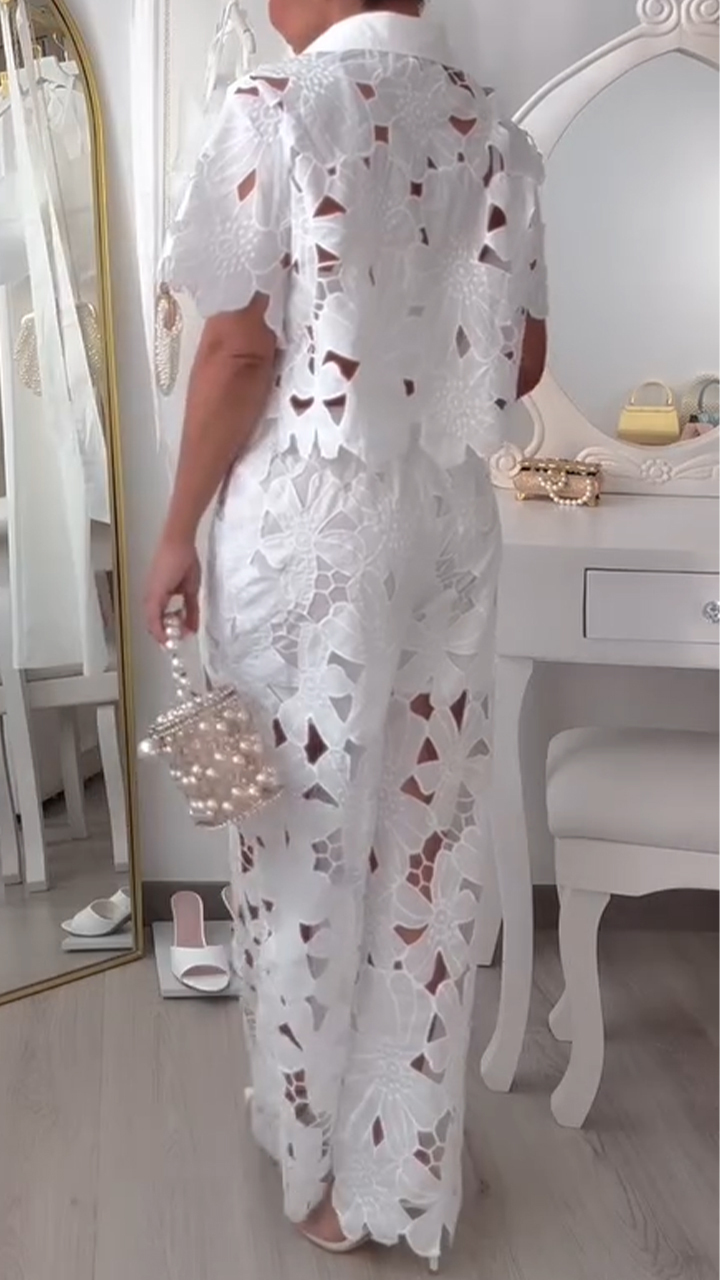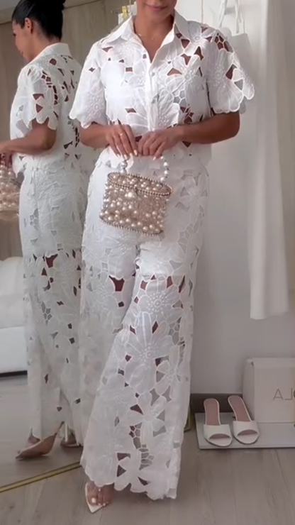 Women's Sexy Solid Color Hollow Cardigan Top Wide Leg Pants Two-Piece Set, Button Women's Lace 2-Piece Set GZ0926