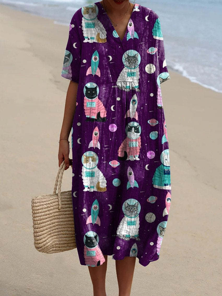 Women's Space Astronaut Cat Geometry Art Print Flowy Dress