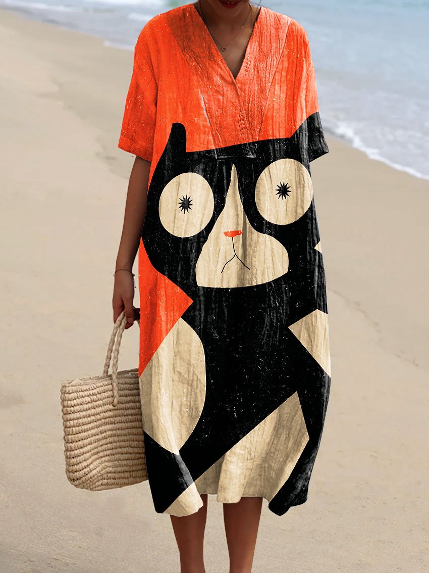 Women's Vintage Abstract Cat Art Print Flowy Dress