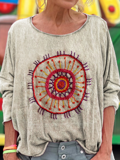 Women's Vintage Patchwork Art Print Casual Long Sleeve T-shirt