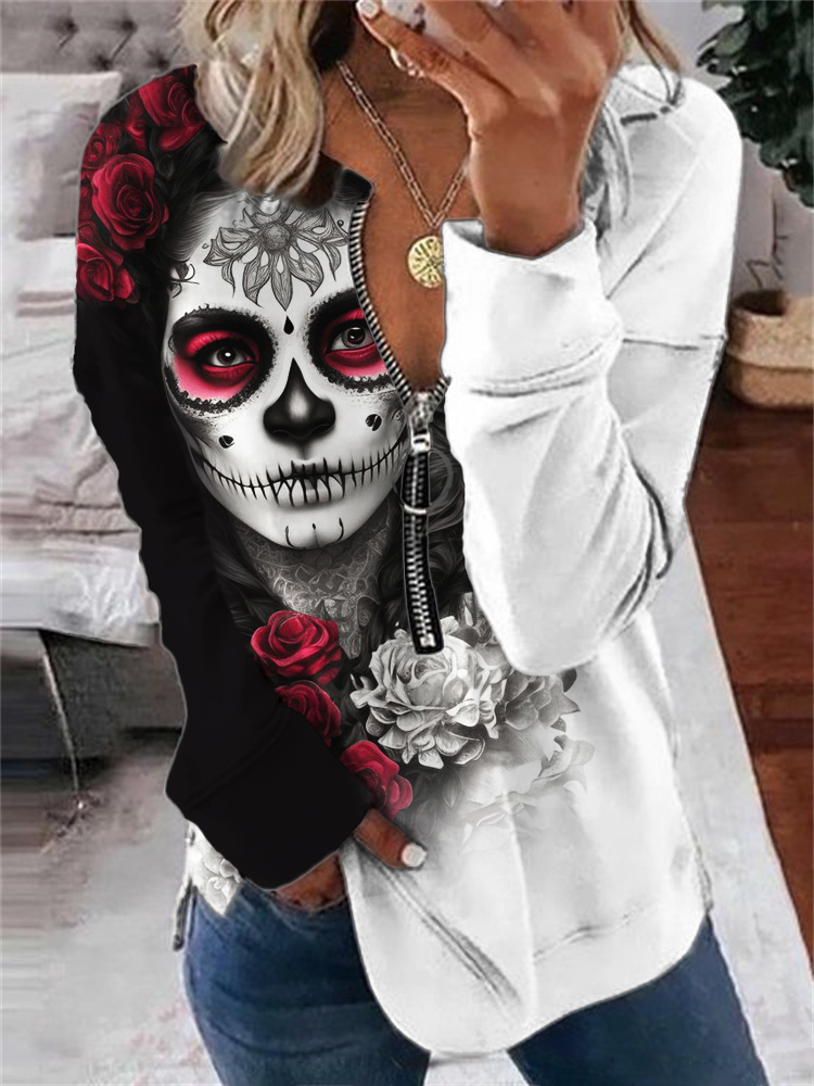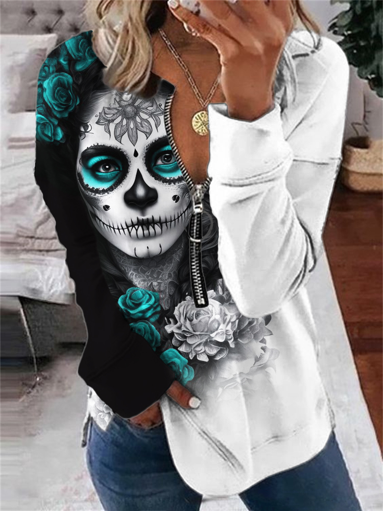 Day of the Dead Art Contrast Zip Up Sweatshirt