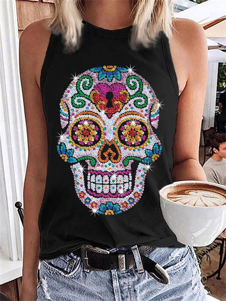Day Of The Dead Sugar Skull Sequins Print Tank Top