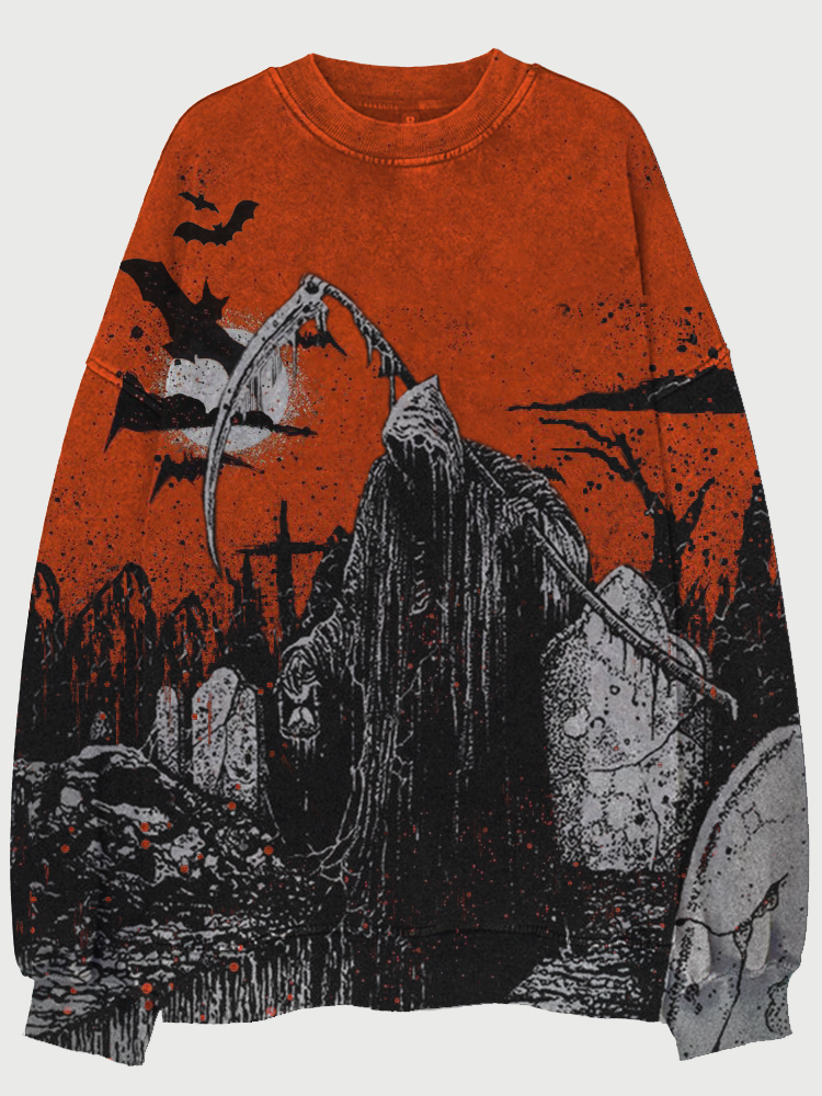 Halloween Death And Bats Pattern Washed Sweatshirt