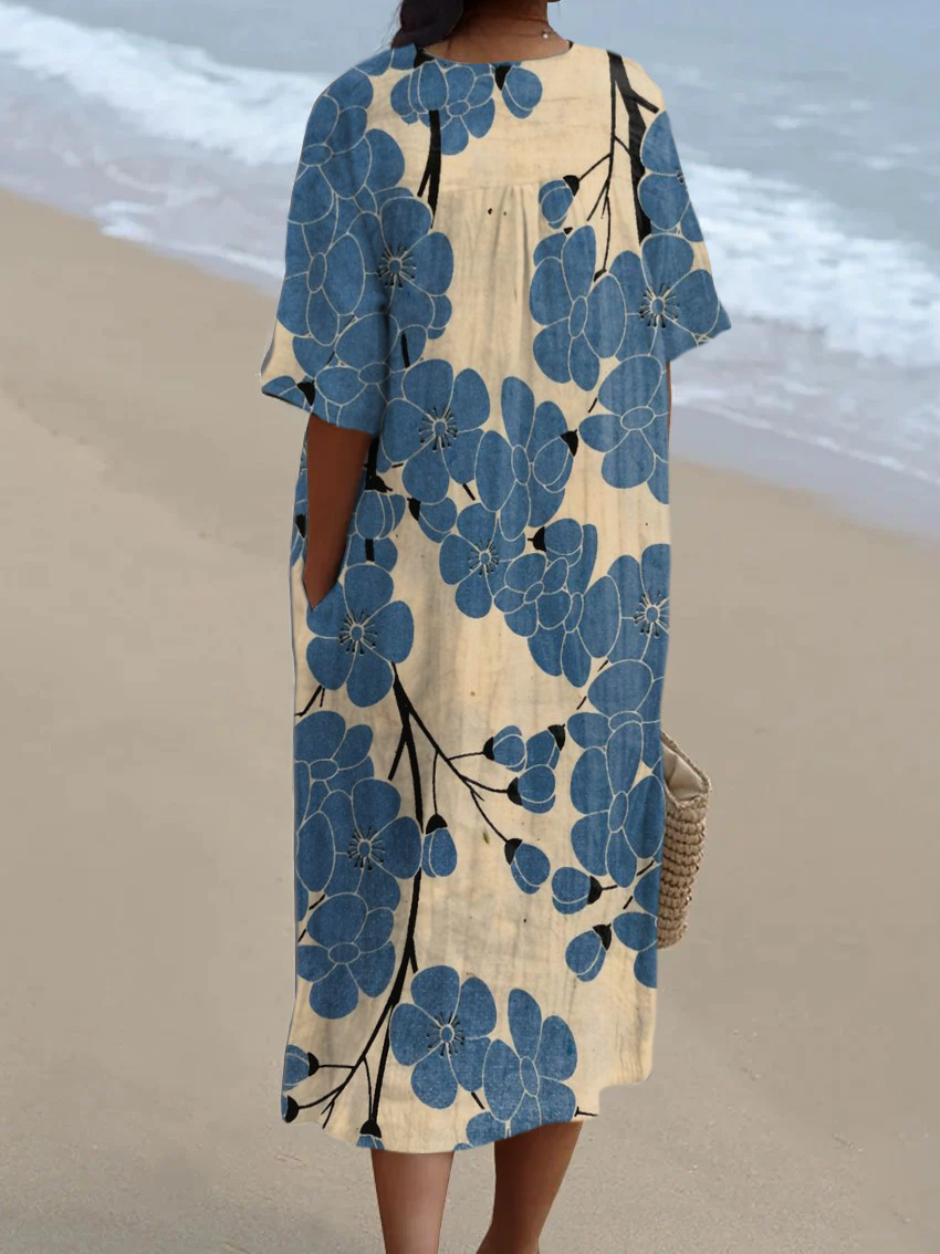 Japanese Plum Blossom Printed Women's V-Neck Pocket Short Sleeve Dress