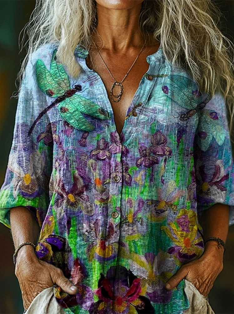 Women's Ethnic Dragonfly Art Pattern Print Casual Cotton Linen Shirt