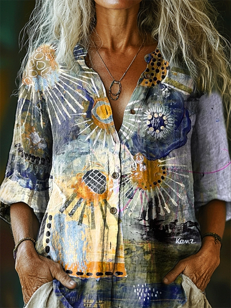 Women's Floral Pattern Art Print Casual Cotton Linen Shirt