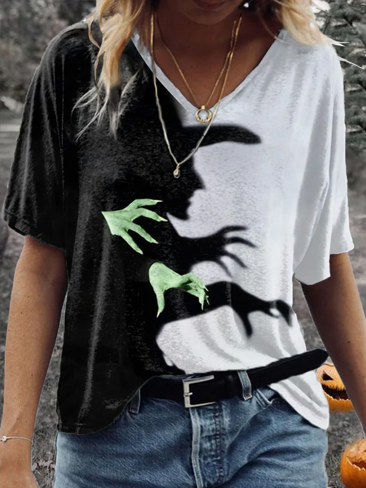 Women's Halloween Witch Shadow Print Casual V-Neck Tee