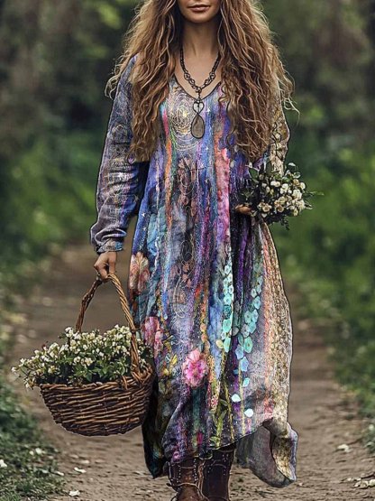 Women's Oil Painting Floral Art Pattern Print V Neck Pocket Cotton Dress