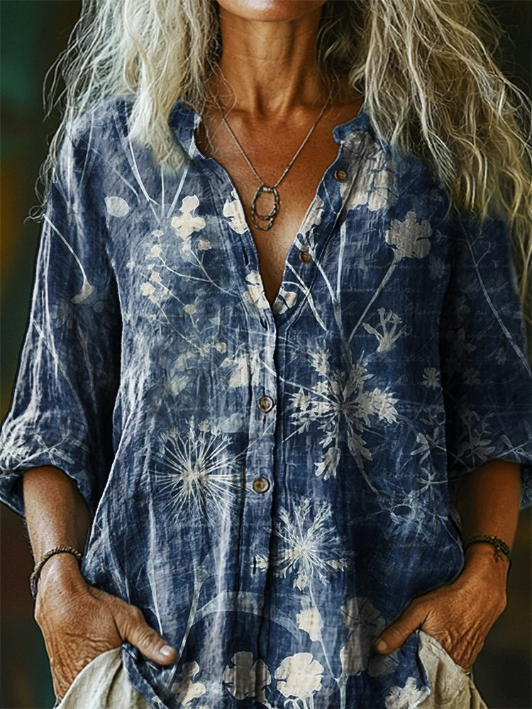 Women's Vintage Bohemian Floral Art Print Casual Cotton Linen Shirt