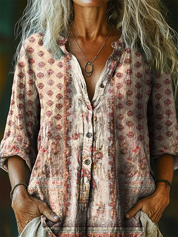 Women's Vintage Ethnic Floral Art Print Casual Cotton Linen Shirt