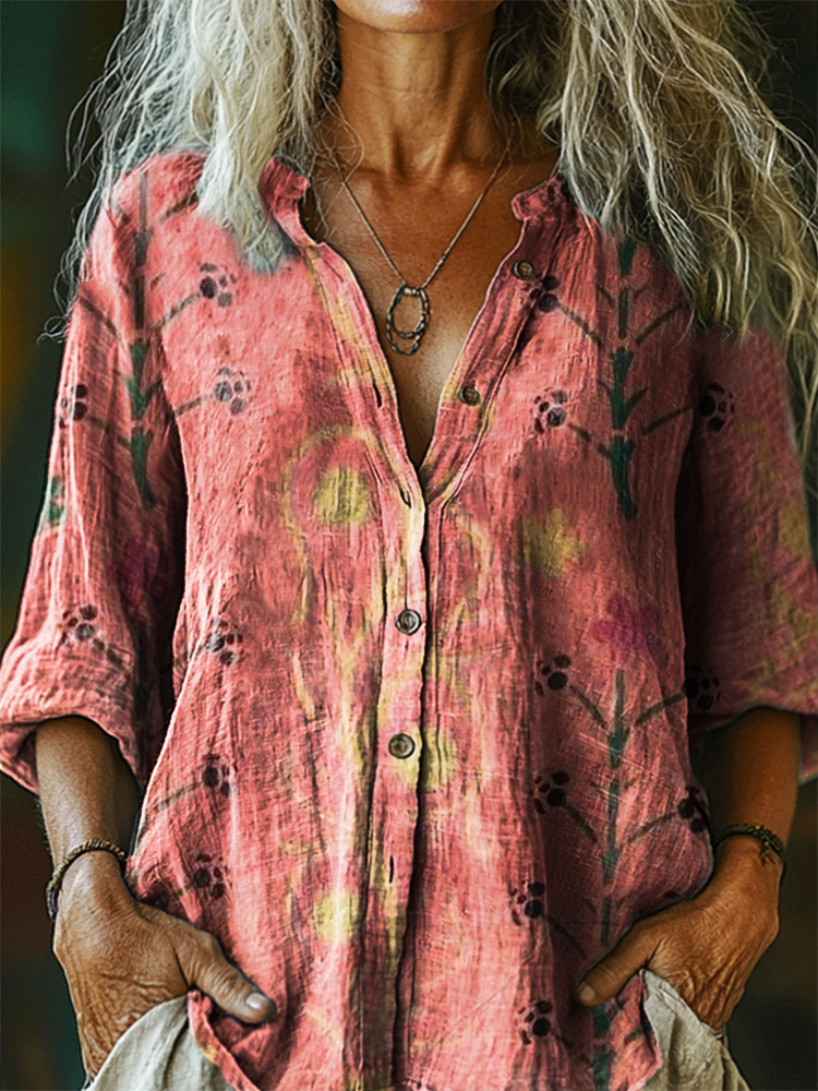 Women's Vintage Floral Art Print Casual Cotton Linen Shirt