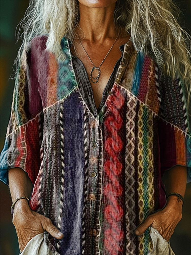 Women's Vintage Stripe Pattern Art Print Casual Cotton Linen Shirt