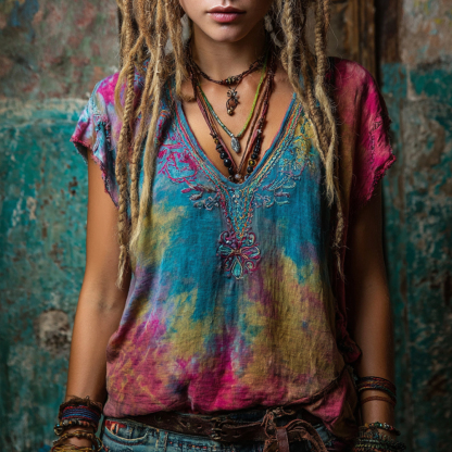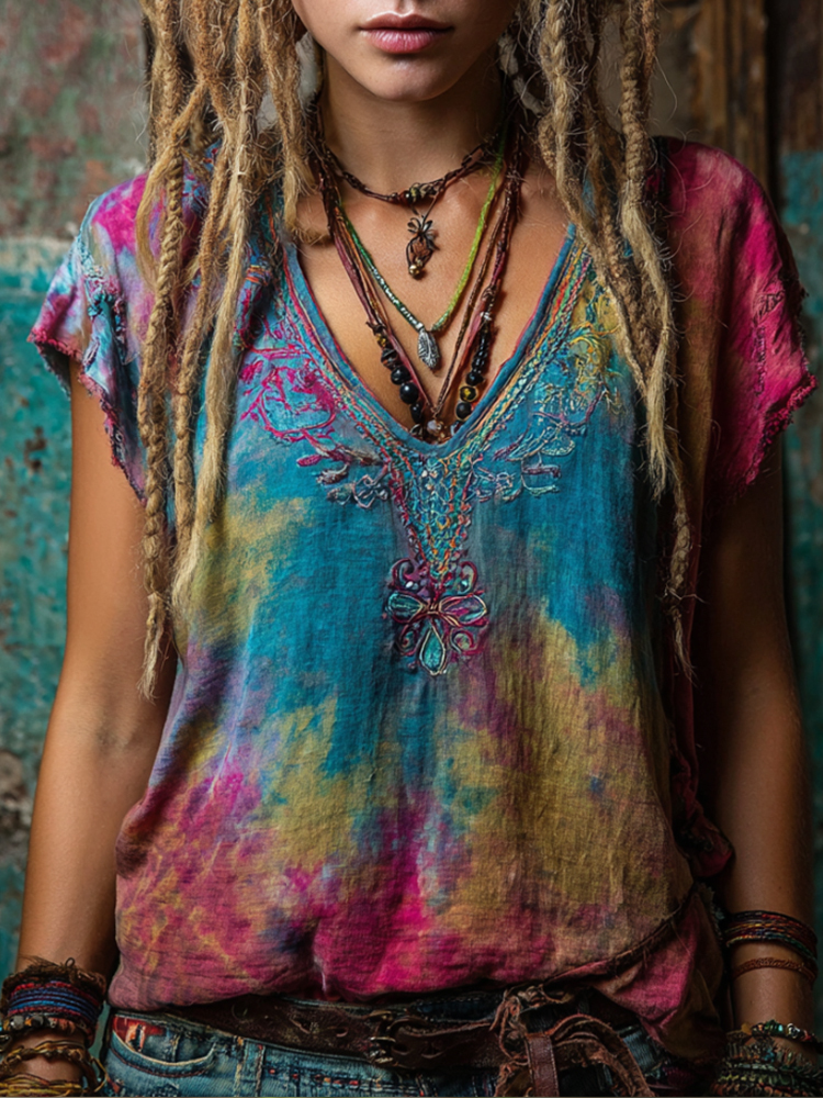 Bohemian Style Personalized Tie-dye Embroidered V-neck Batwing Sleeve Top