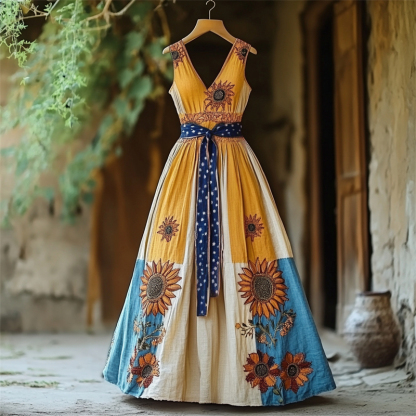 Boho Sunflowers Ukraine Colorblock Linen Maxi Dress